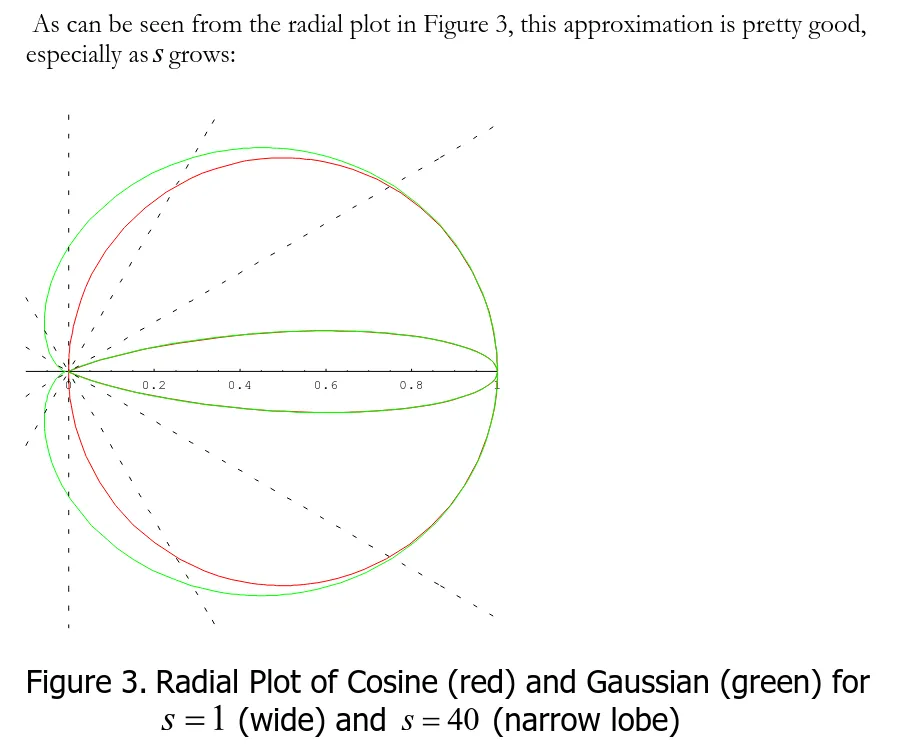 Blinn-Phong モデルのスペキュラのローブは で表されます。 これを次のようなガウス分布の形で近似します。